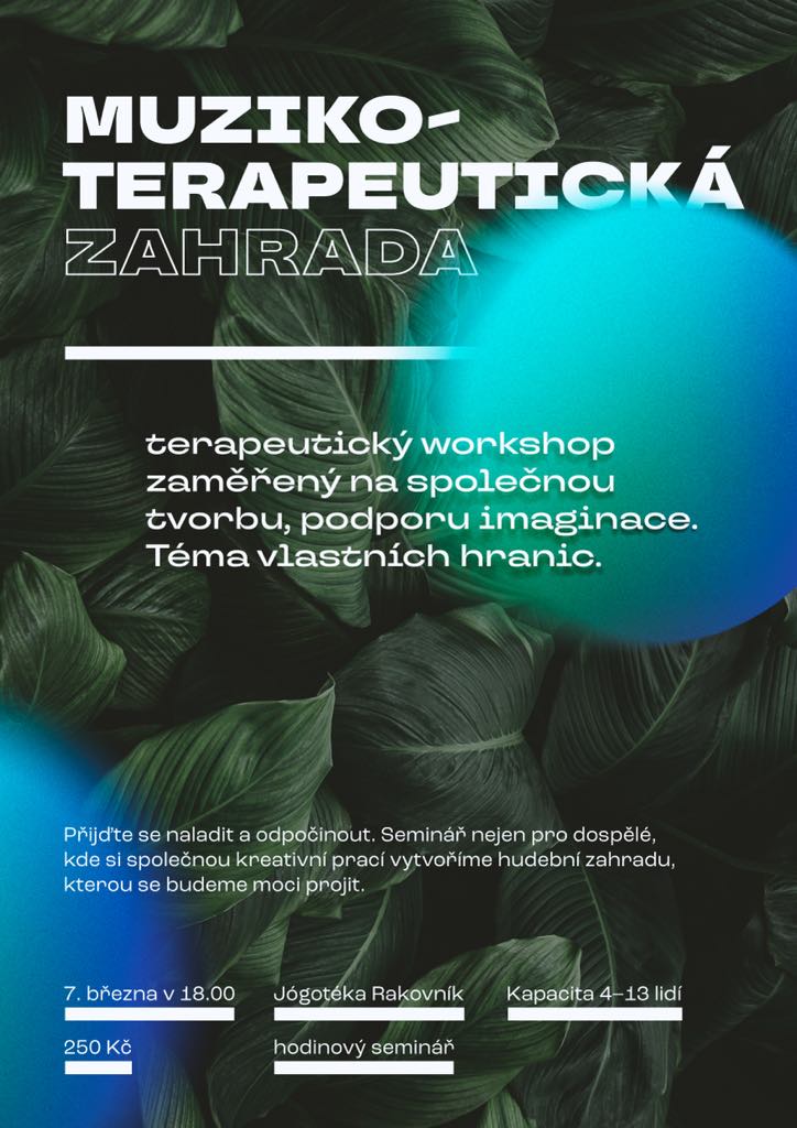 Přijďte se naladit a odpočinout. Vzpomenout si na místa, kde nám bylo dobře. Seminář nejen pro dospělé, kde si společnou kreativní prací vytvoříme hudební zahradu. Tou se pak můžeme i projít, a to 18. 3., 8. 4. a 22. 4., vždy od 18h.